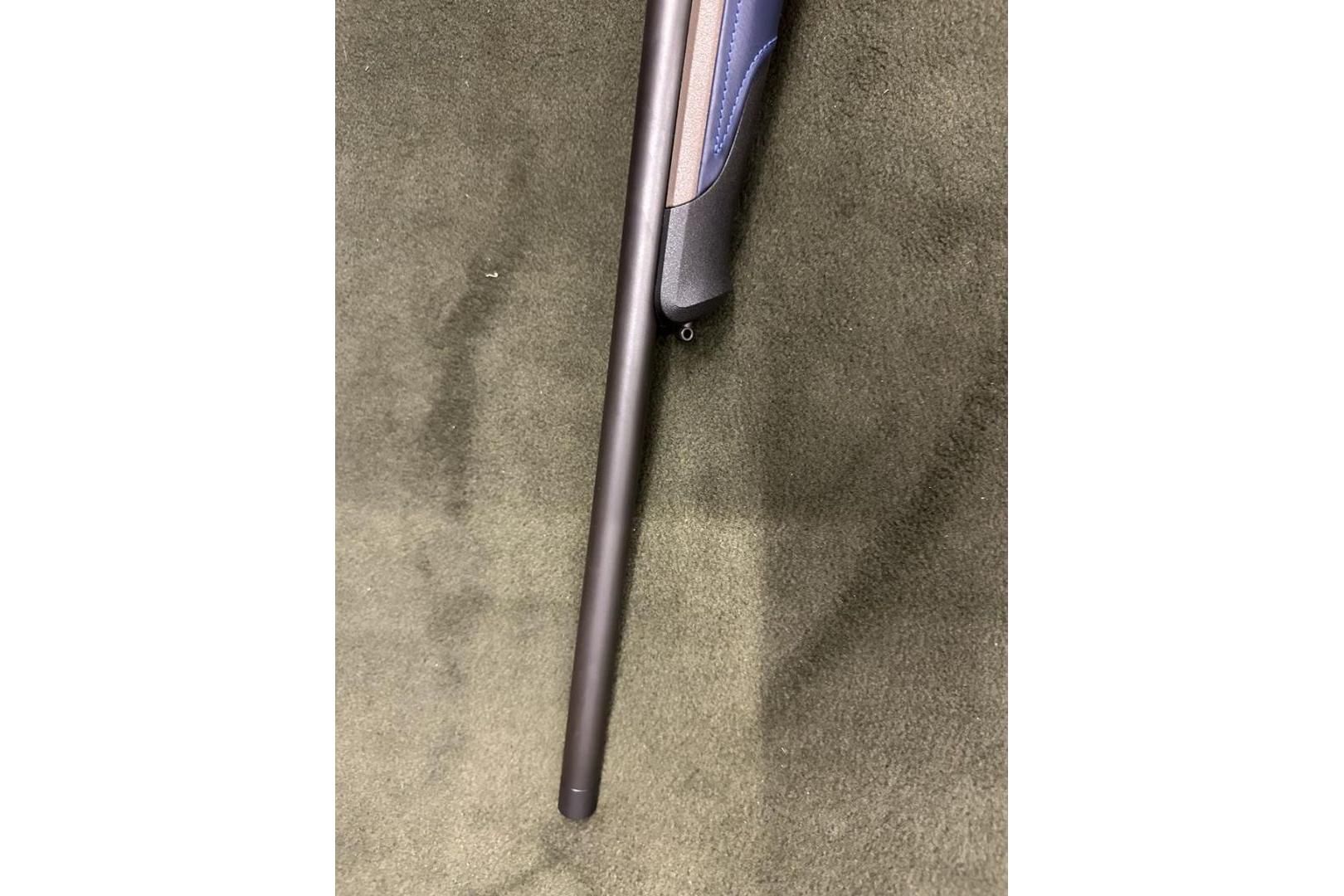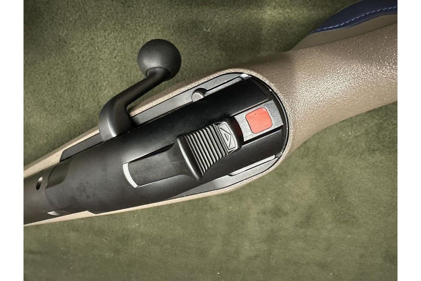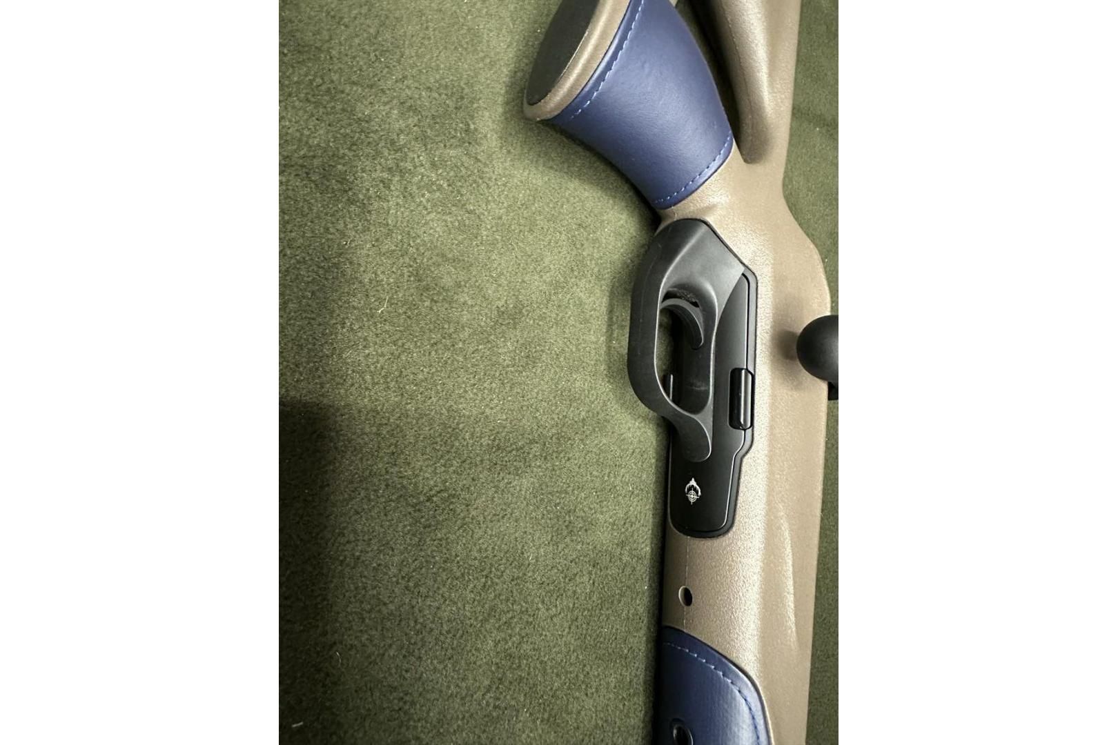 Ciekawa osada na zamówienie z serii Blaser Custom - kolba w kolorze Savannah ze wstawkami z granatowej skóry.