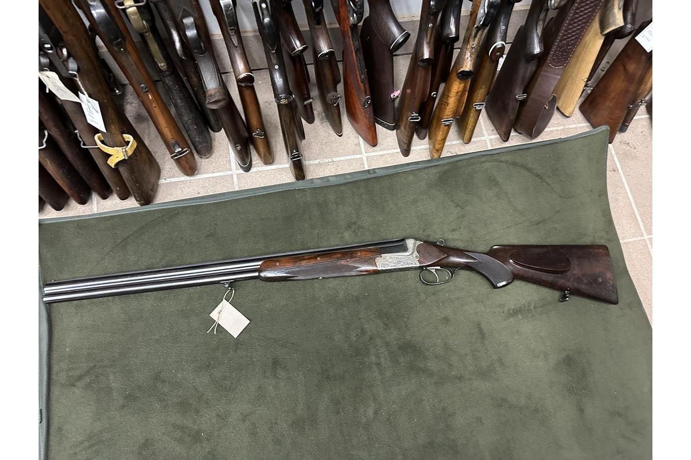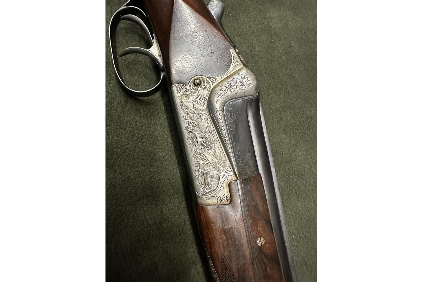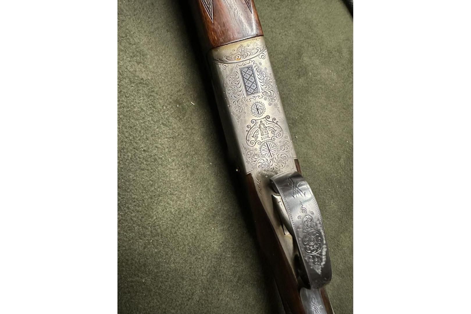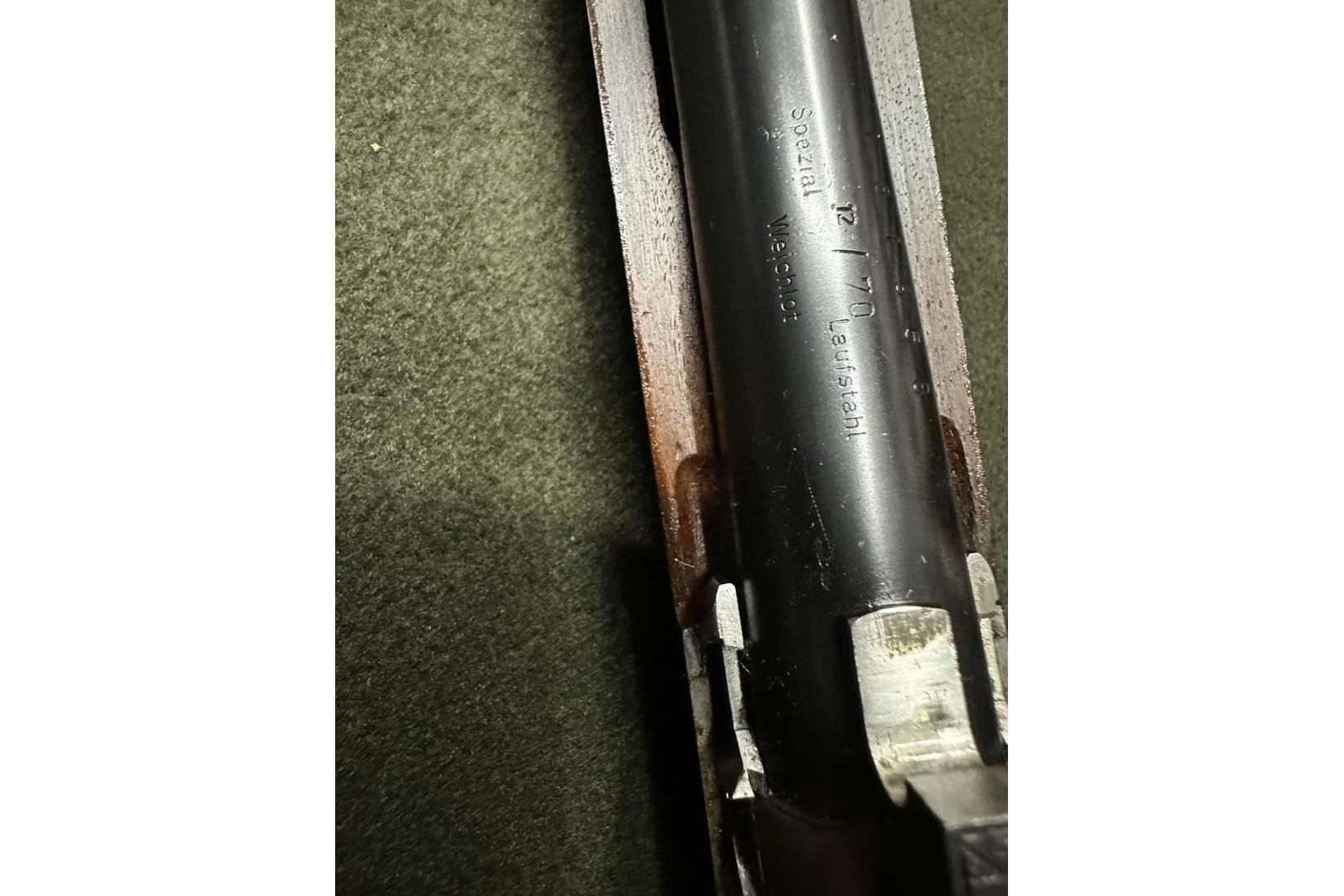 Bock Merkel 201E kal. 12/70. Lufy, dł 71cm, ładnie grawerowany, posiada wyrzutniki, wnętrze luf bdb. Rok prod 1990.