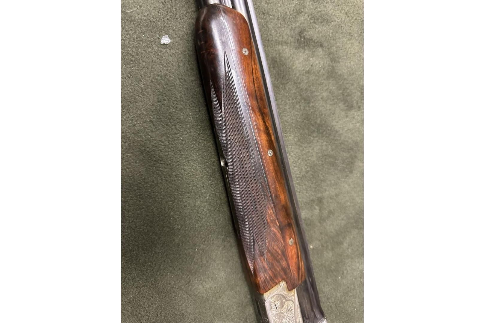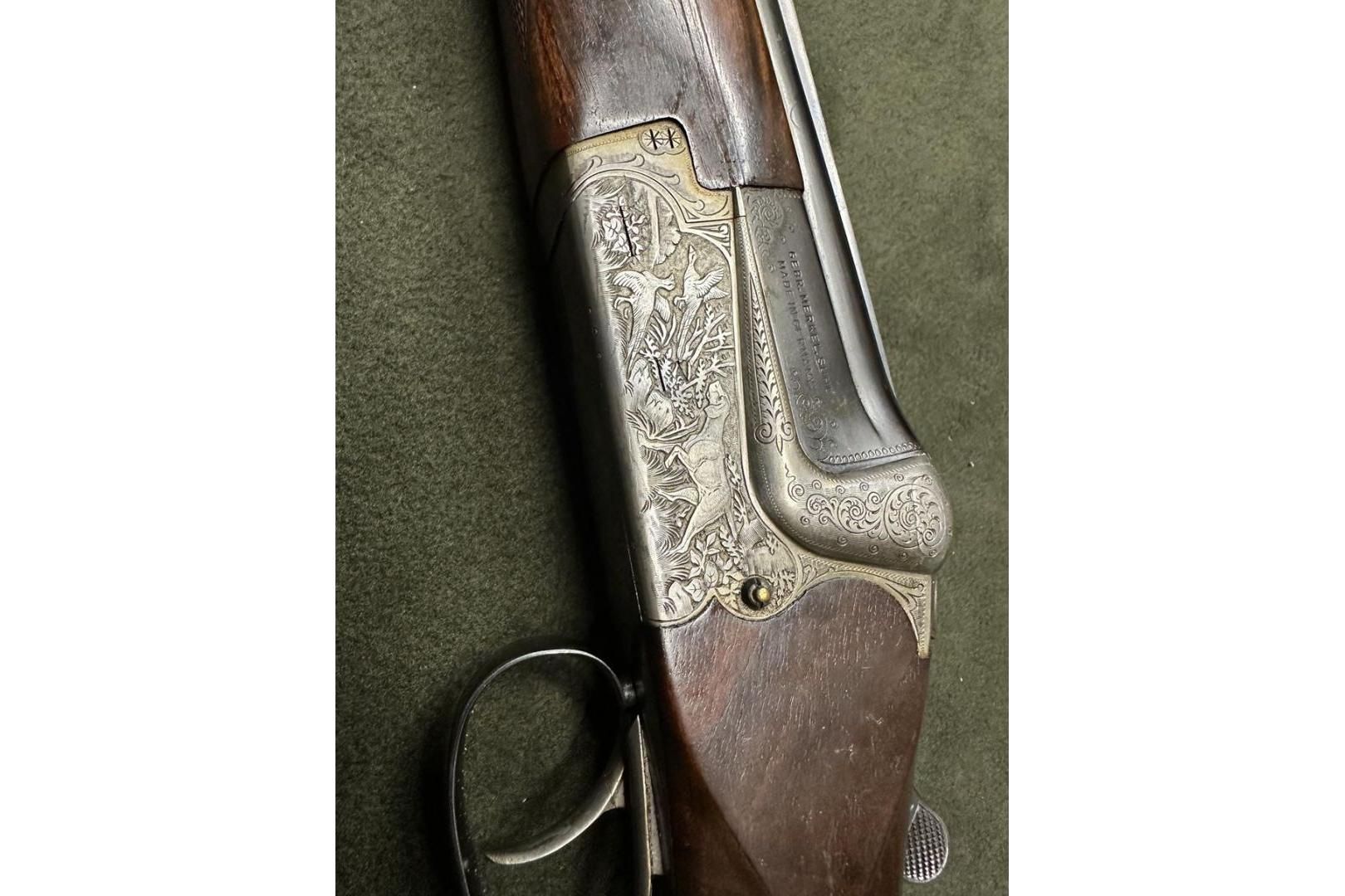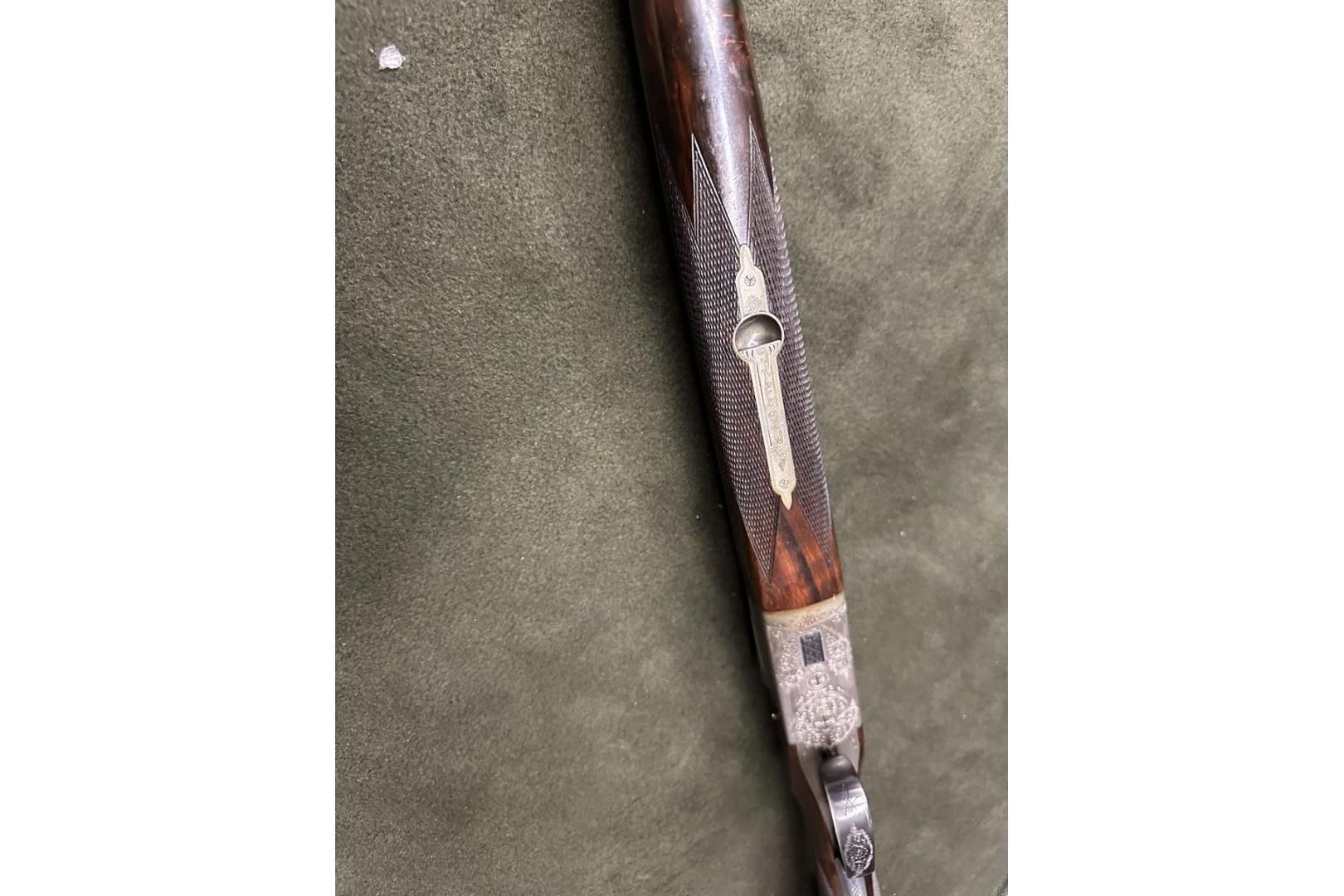 Bock Merkel 201E kal. 12/70. Lufy, dł 71cm, ładnie grawerowany, posiada wyrzutniki, wnętrze luf bdb. Rok prod 1990.