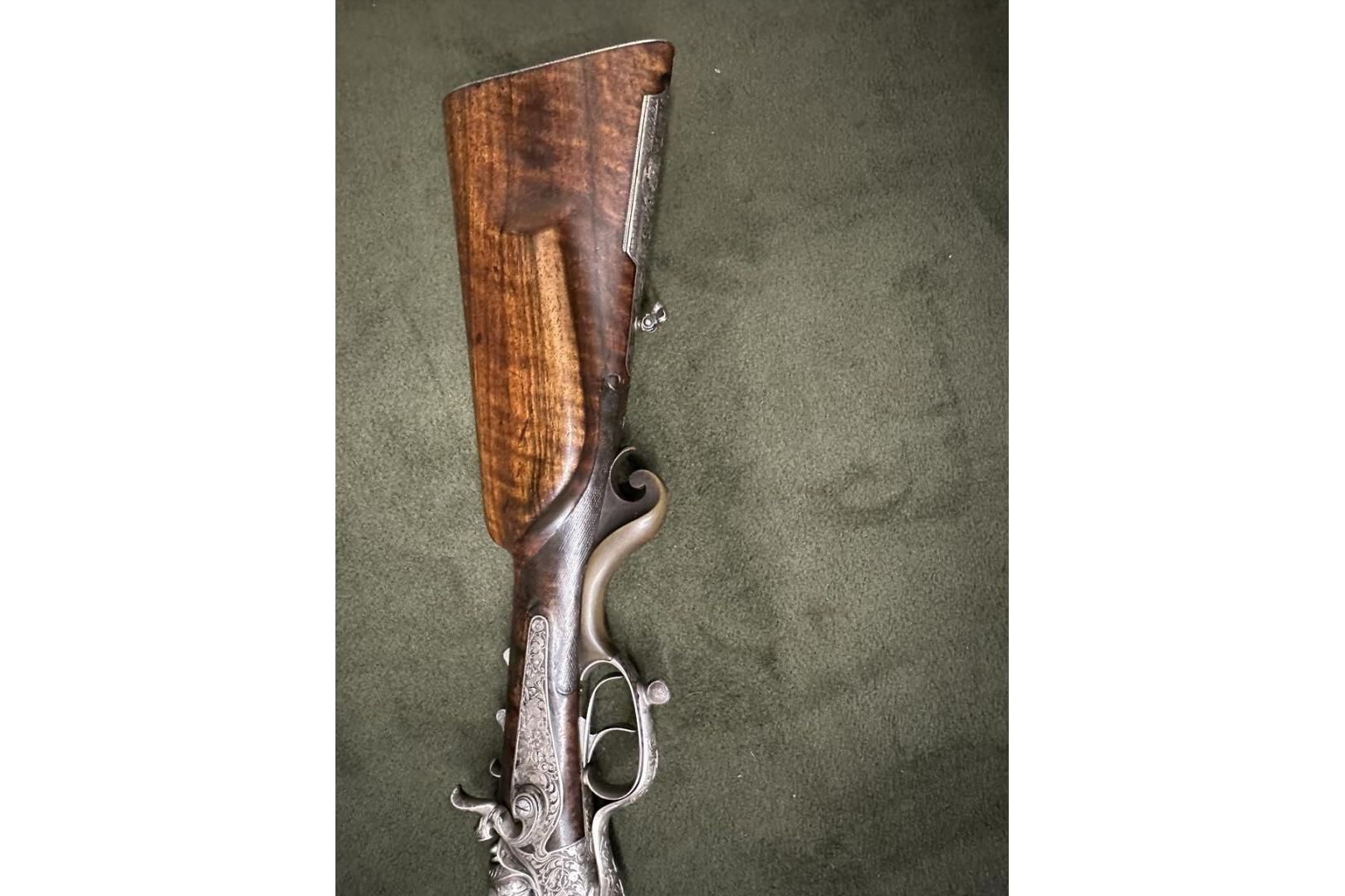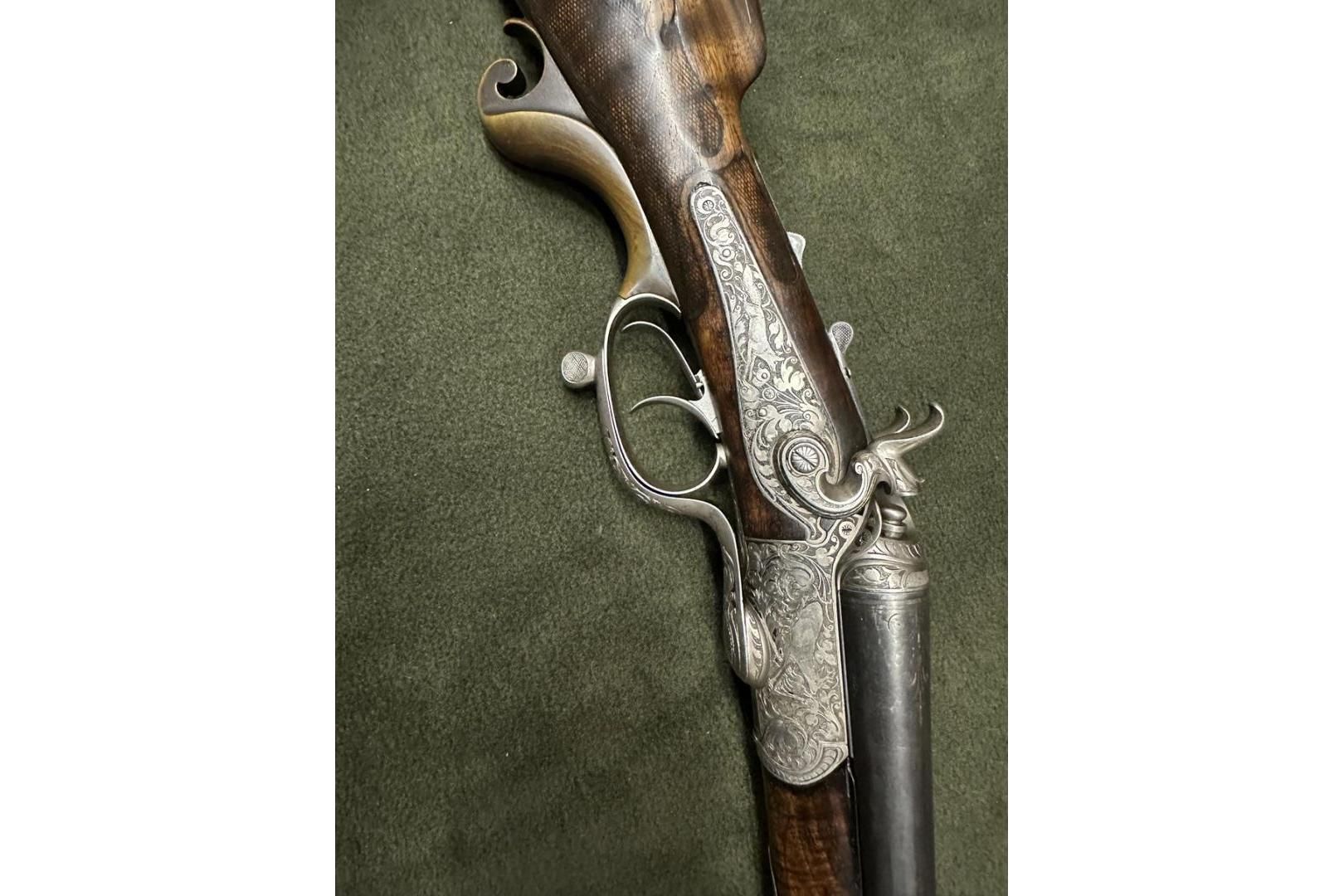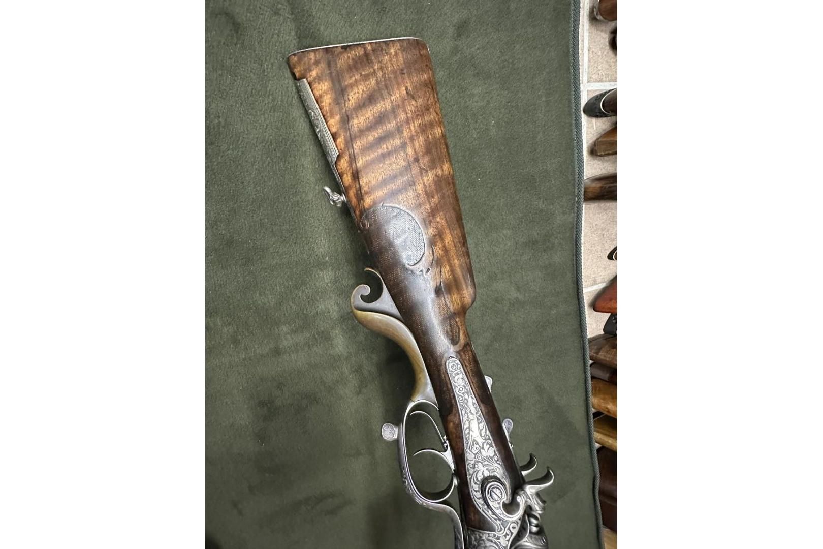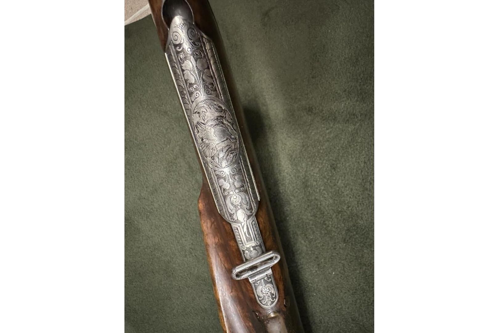 Dryling kurkowy Waydt prod belgijskiej kal 8x58R 16/65. Pięknie grawerowany dryling kurkowy otwierany dolnym kluczem, schaftmagazine.