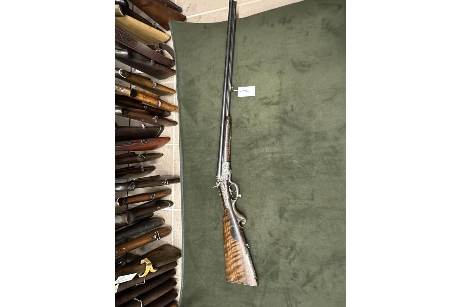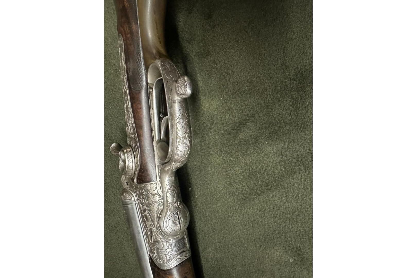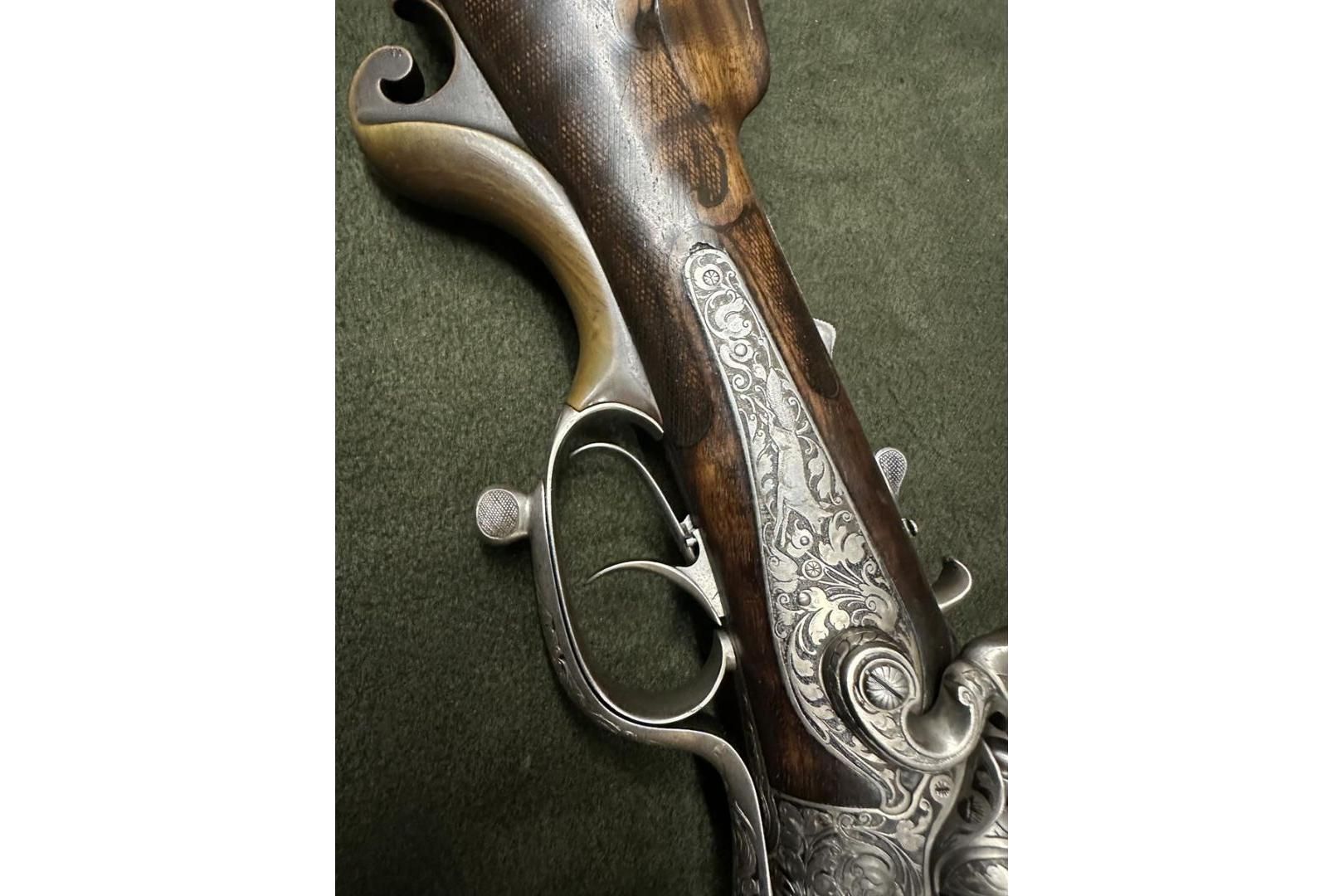 Dryling kurkowy Waydt prod belgijskiej kal 8x58R 16/65. Pięknie grawerowany dryling kurkowy otwierany dolnym kluczem, schaftmagazine.