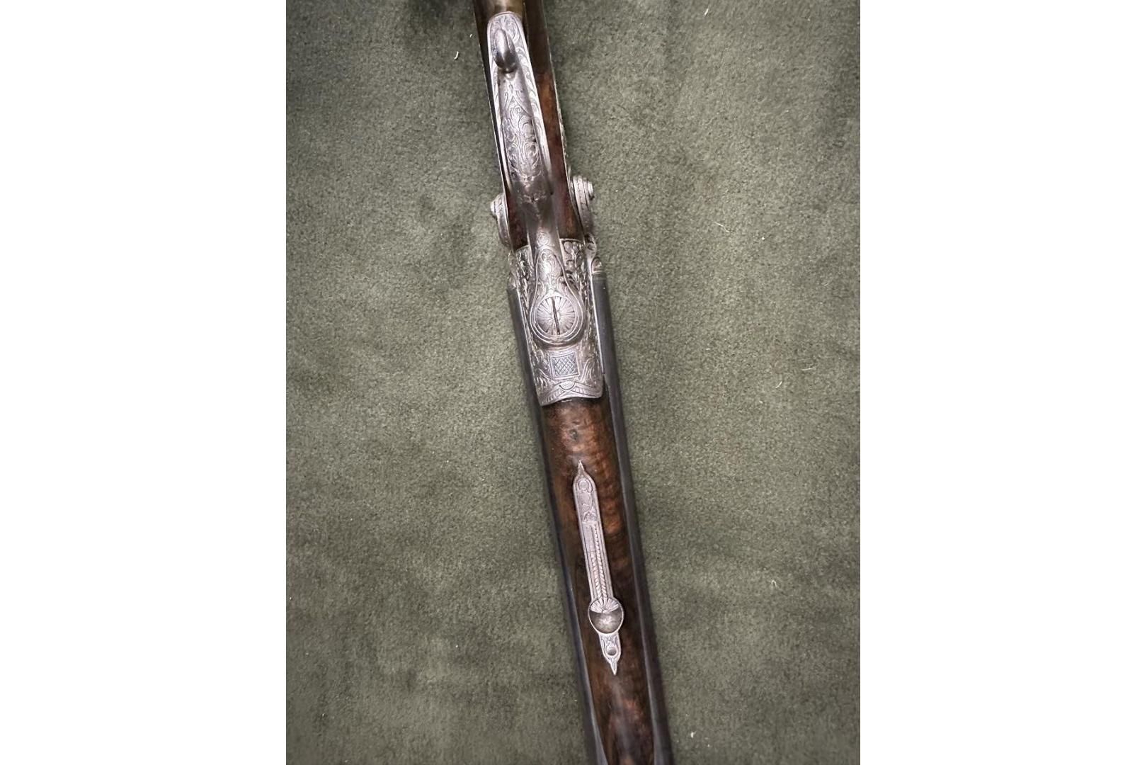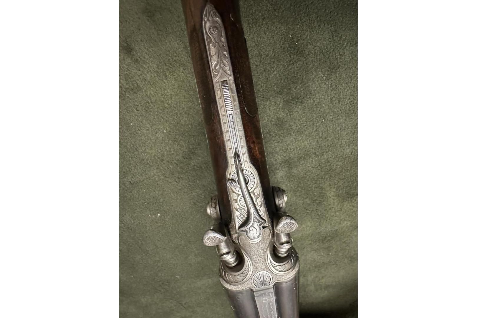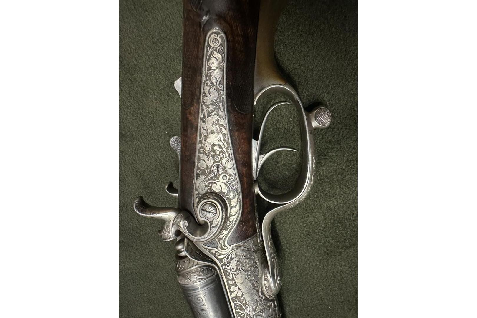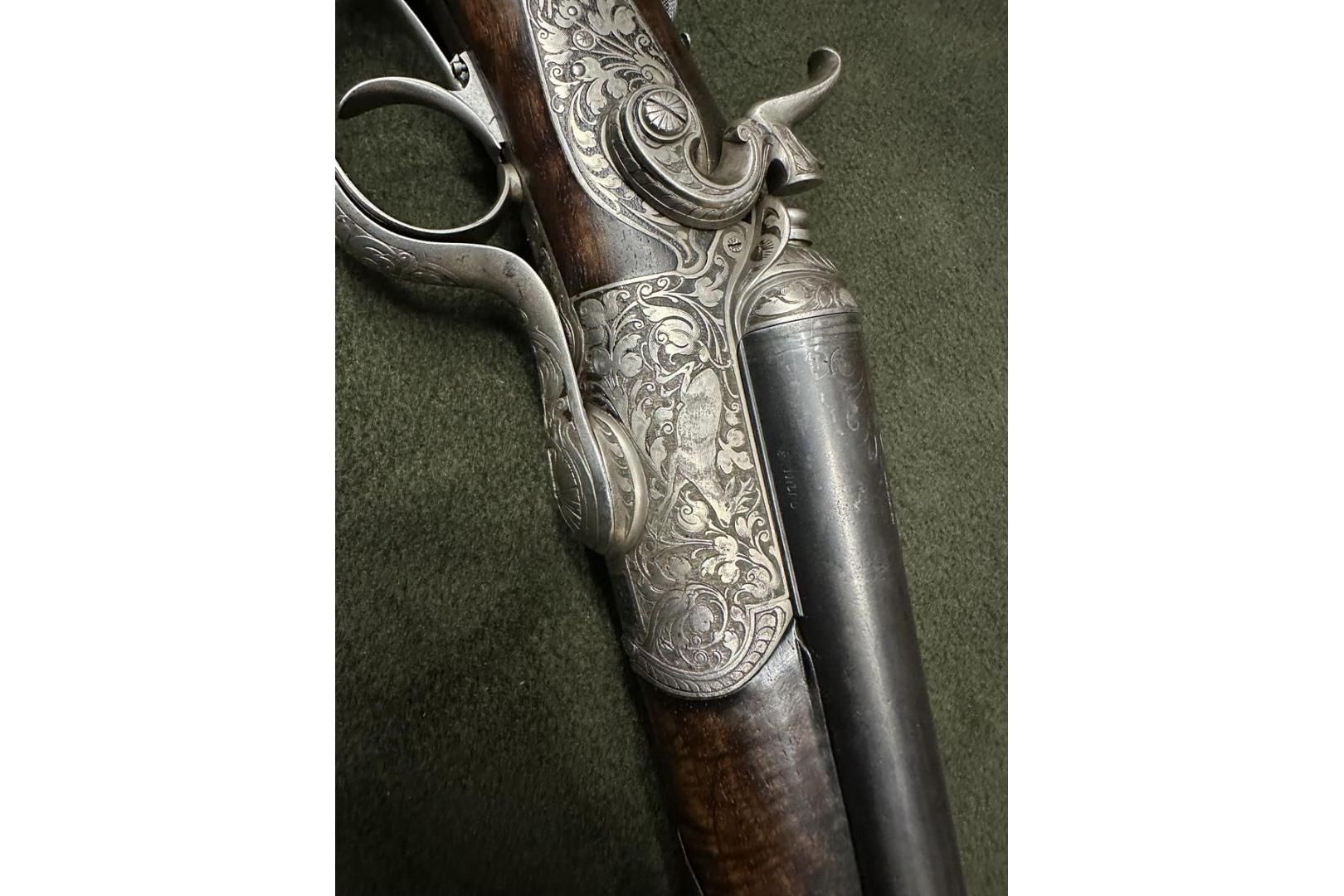Dryling kurkowy Waydt prod belgijskiej kal 8x58R 16/65. Pięknie grawerowany dryling kurkowy otwierany dolnym kluczem, schaftmagazine.