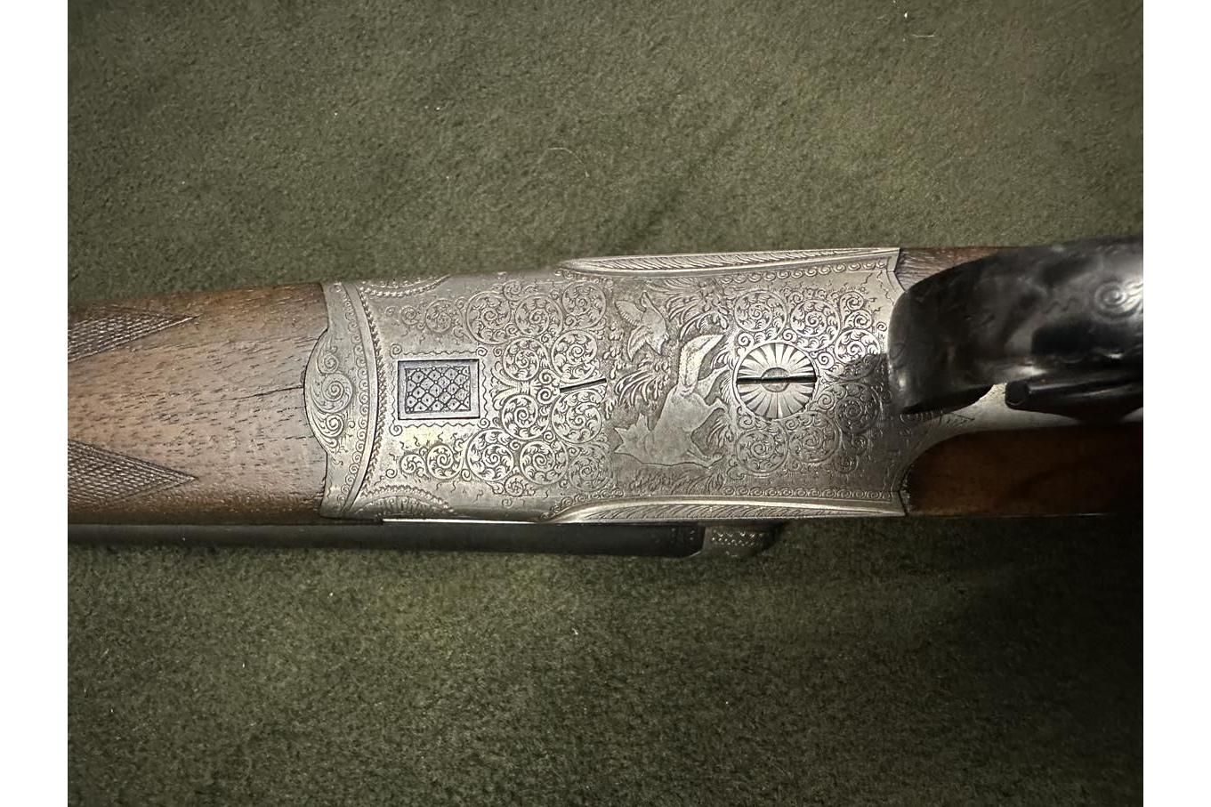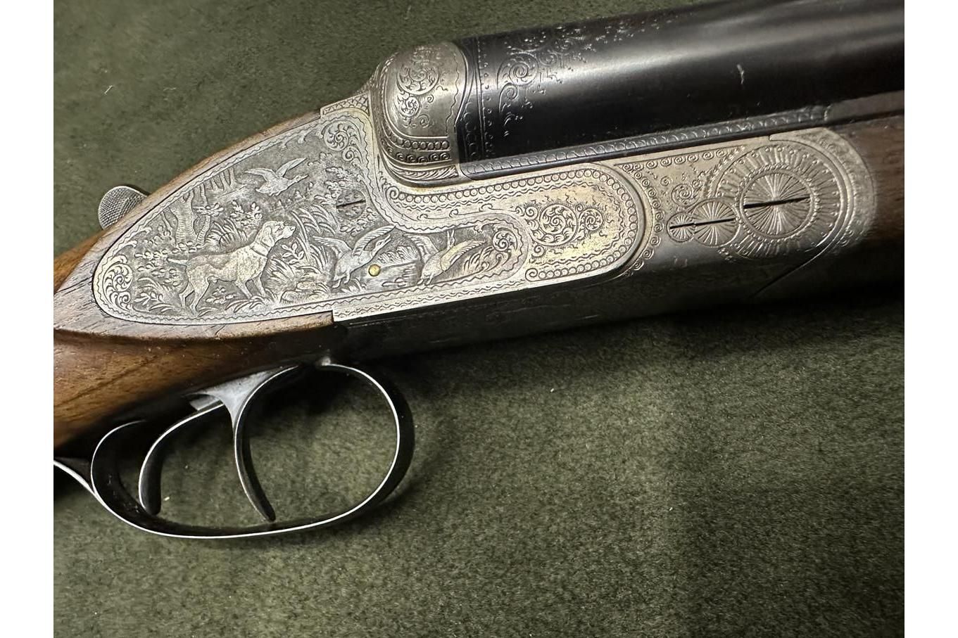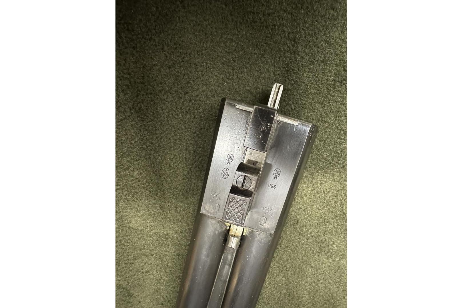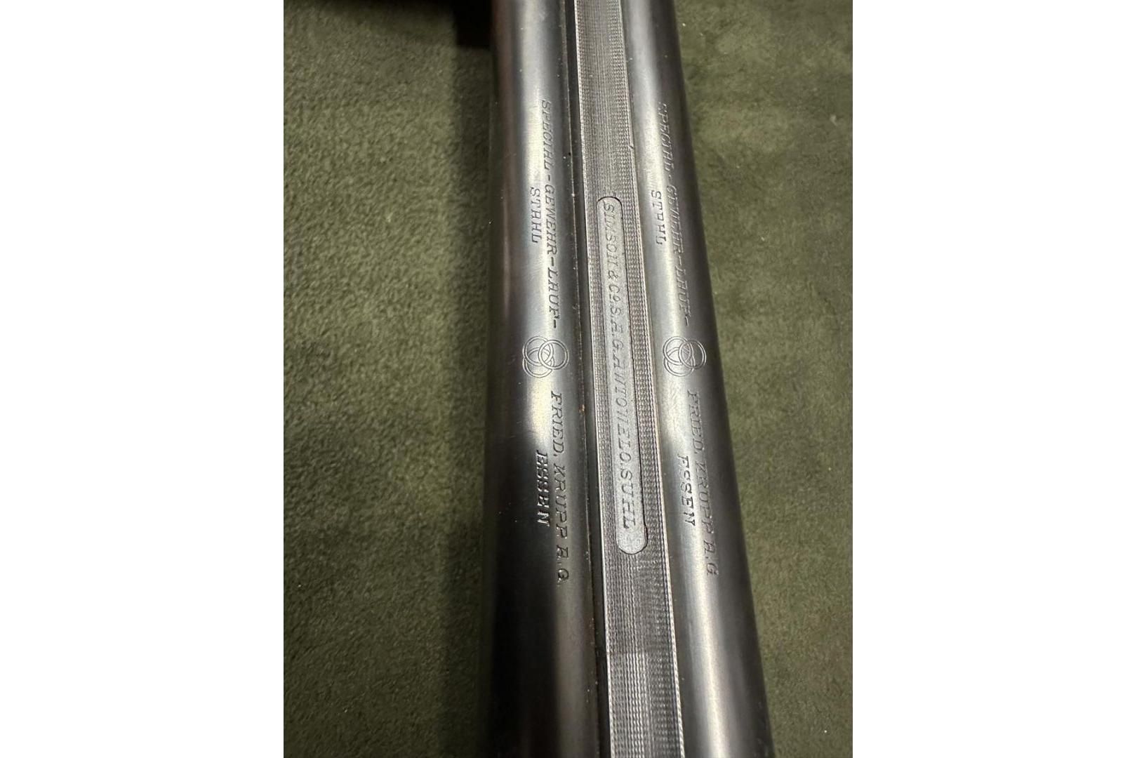 Dubeltówka Simson kal. 16/70, bardzo ładnie grawerowane pełne blaty, posiada wyrzutniki lufy ze stali Krupp, dł 72cm, rok prod. 1950, stan bdb.