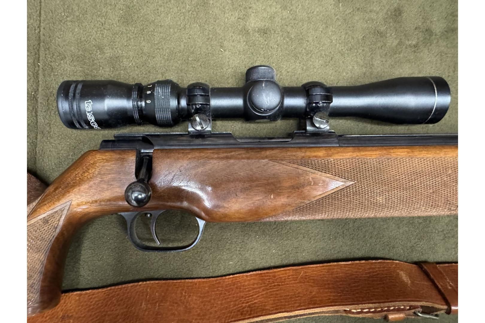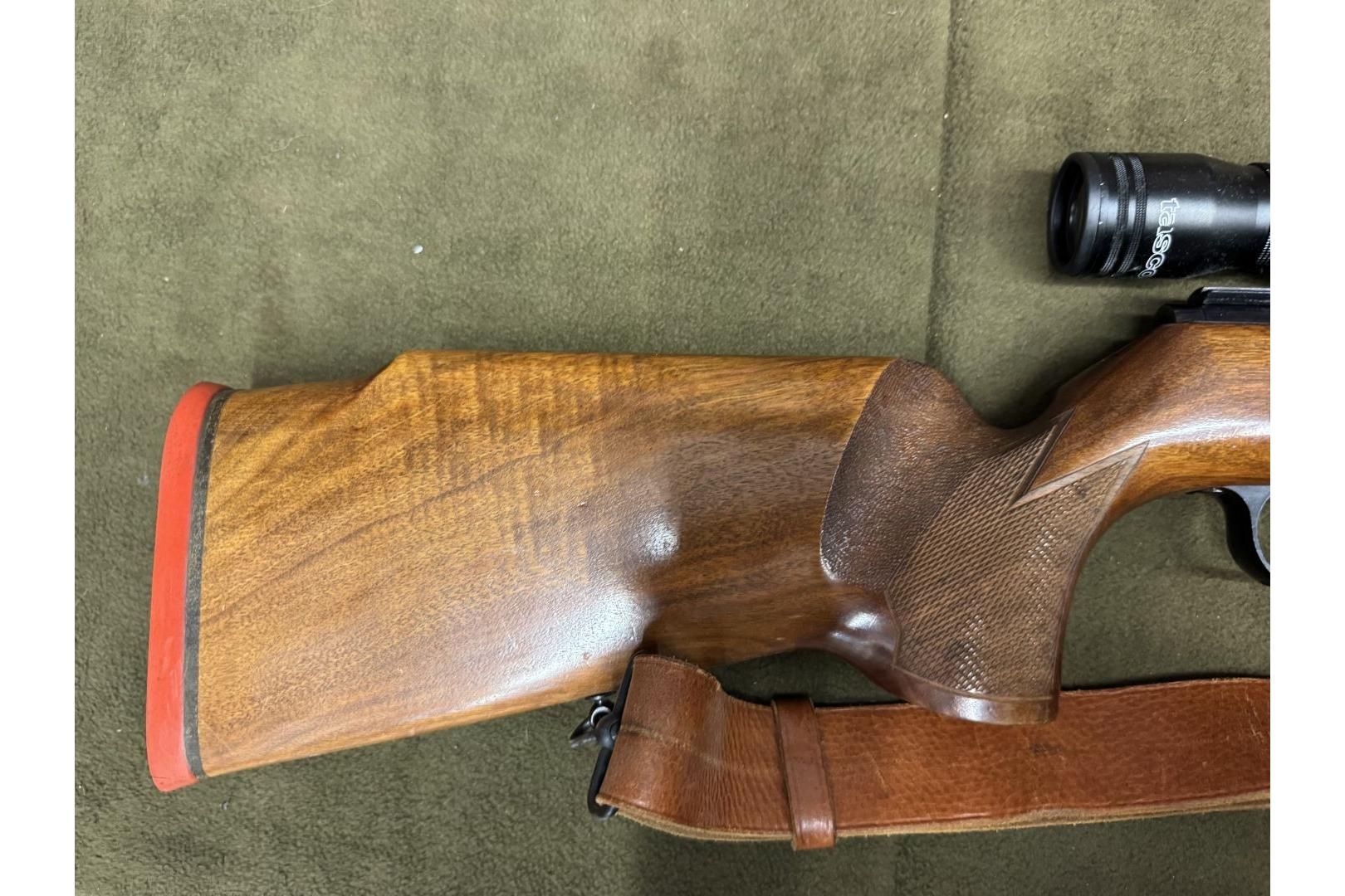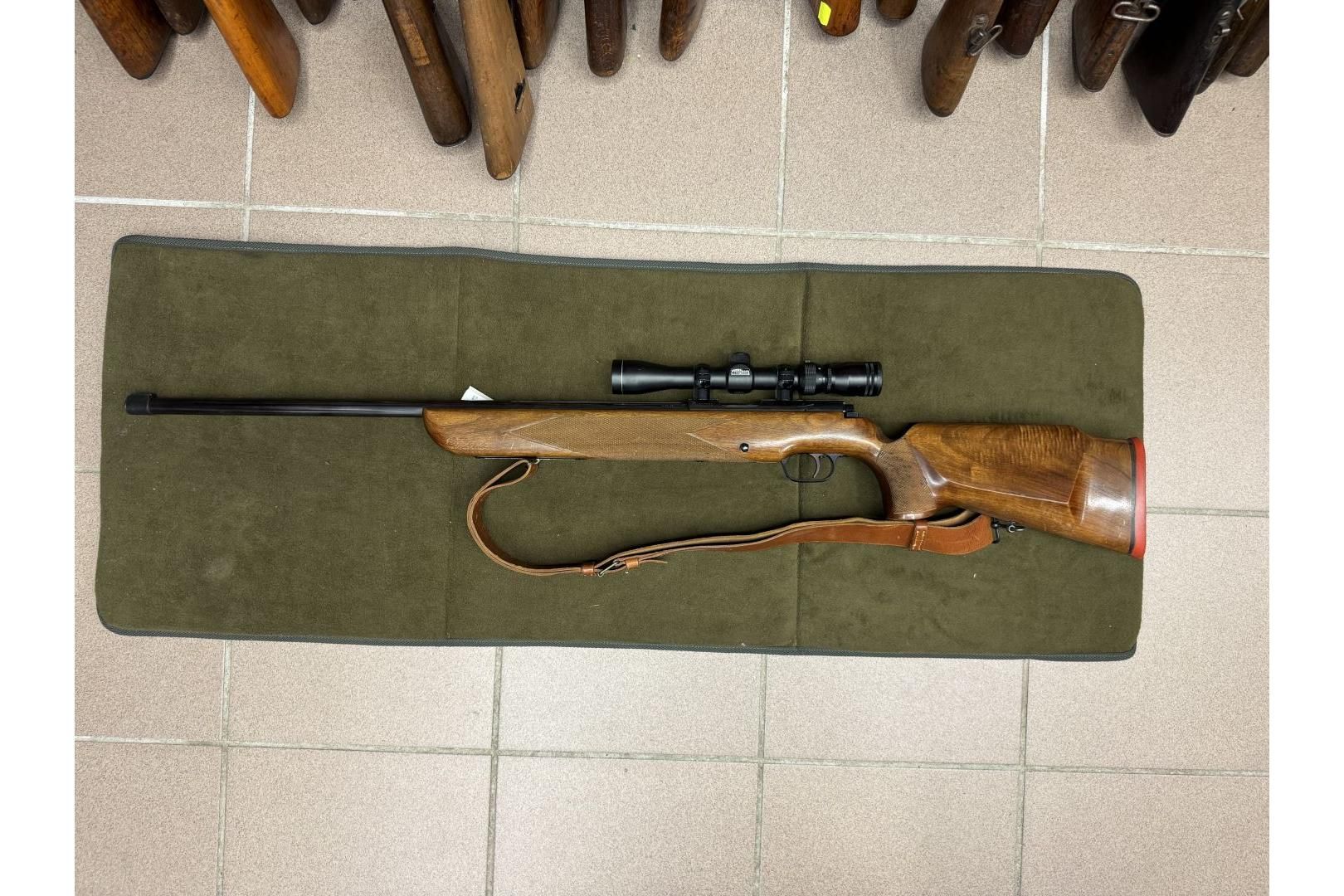Karabin Walther Match .22lr wraz z montażem i lunetą.