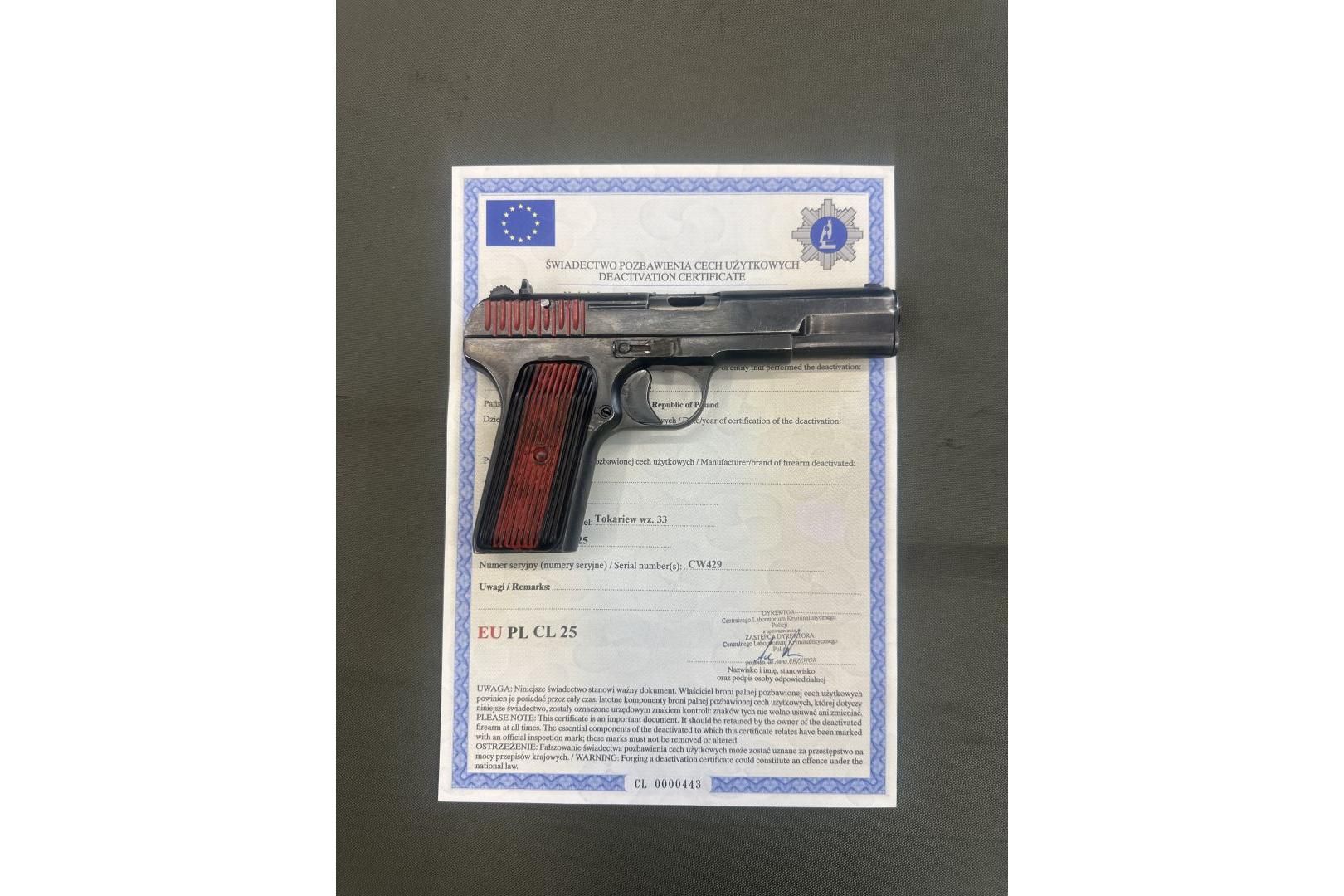 Pistolet TT wz.33 Radom, pozbawiony cech użytkowych zgodnie z normami EU z certyfikatem CLKP.